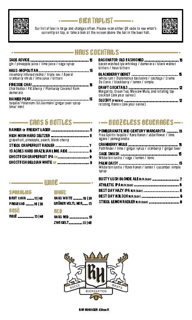 Check out our Haus cocktails, wine, non-alcoholic, digestifs, and of course our beer list! Featuring local brews, Belgian styles, gluten-free options and more. Our taps are many and they rotate often.